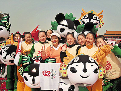 【本報駐山東記者殷江宏濟南31日電】在今天的北京2008年奧運會火炬傳遞啟動儀式上,游泳運動員出身的青島啤酒營銷總裁嚴旭(圖左二)女士格外引人矚目。作為北京奧運的火炬手,嚴旭將參加山東段火炬接力傳遞。這位商界著名的「鐵娘子」在接受採訪時表示,為有幸見證這偉大的盛事而倍感自豪。