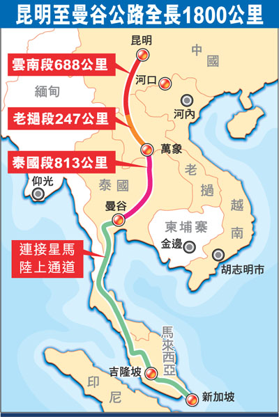昆曼大通道起自雲南昆明,公路經玉溪、普洱、景洪到達中(國)老(撾)邊境的磨憨口岸,出境後經老撾萬象,直達泰國首都曼谷,全長1,800公里。其中,中國境內688公里、老撾境內247公里、泰國境內約813公里。