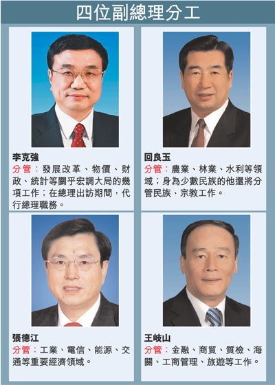 今年「兩會」產生了新一屆國務院組成,溫家寶續任國務院總理,副總理層面除回良玉續任,尚有李克強、張德江、王岐山3位原地方大員作為新人出任副總理。4位副總理中,除連任的副總理回良玉繼續分管農業、水利及民族事務外,其餘3位新晉副總理的分工亦明朗化。