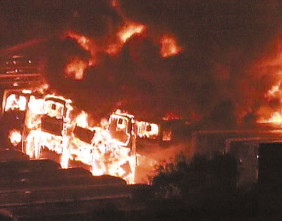 ■天水圍10輛巴士著火焚燒,火焰衝天。 無線電視畫面