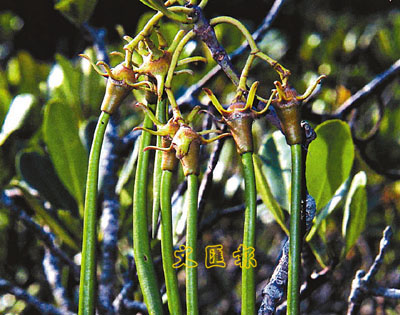 •Those viviparous seedlings are called droppers.Its elongated shape, with a sharp end, looks like a Chinese brush-hence its Chinese name, "Little Water Pen". This common mangrove species is found in nearly all mangrove swamps in Hong Kong. The tree grows up to 5 m in coastal mudflats. Its droppers can be seen during most of the year, except from May to July.
