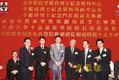 【本報訊】東華三院日前在東華醫院李兆忠紀念大堂,舉行東華醫院李耀祥博士紀念腎科中心、李耀祥博士紀念腎科科研中心及李耀祥博士紀念門診部命名典禮,邀得國家中醫藥管理局副局長李大寧教授、香港大學李嘉誠醫學院院長梁憲孫教授及醫院管理局港島西醫院聯網總監賴福明醫生主禮。