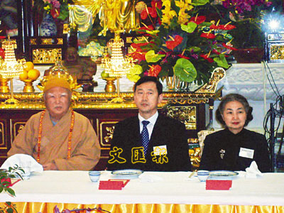 ■朝陽市長張鐵民(中)出席朝陽西方寺香港招商茶話會。香港基本法起草委員會副主任梁愛詩(右)亦有出席。