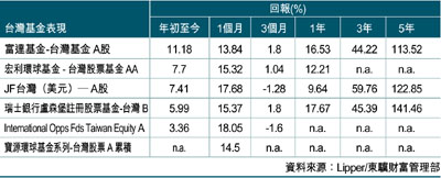 現時市場上共有6隻投資台灣的基金,短線而言,以主要持有資訊科技資產(佔34.5%)的富達台灣基金的走勢相對較佳,年初至今上升11.18%,跑贏大市。中長線而言,則以JF台灣基金的表現較為突出,3年回報達59.76%。