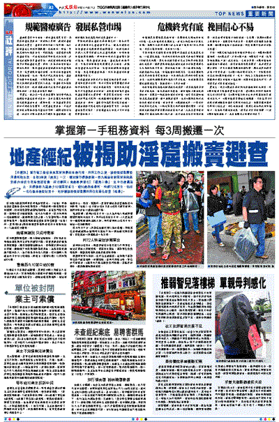 【本報訊】警方首次揭發有具黑幫背景的地產代理,利用工作之便,協助賣淫集團租用場所做生意,且每3周便「搬竇」一次,增加警方掃蕩困難。西九總區針對黑幫有組織安排內地妓女來港賣淫活動,前日聯同入境處展開第8次「獵黃行動」,至今日凌晨為止,共掃蕩西九龍最少10個黑幫堂口,逾50處色情場所,拘捕72名男女,包括一名任職地產經紀男子,他涉嫌協助賣淫集團利用住宅單位經營「暗場」。