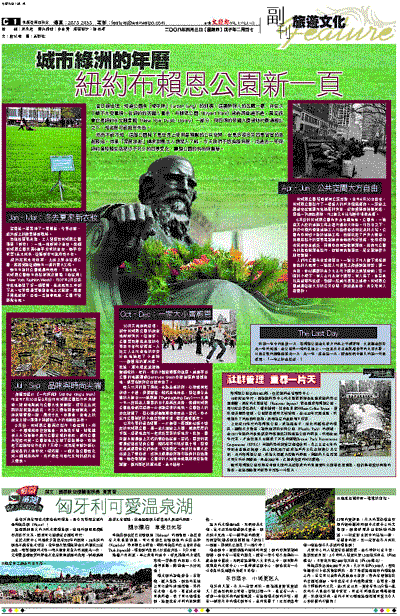 昔日讀地理,知道公園有「城中肺」(urban lung)的別稱,這種肺與人的五臟一樣,存在久了總不太受重視。在紐約的美國人看來,布賴恩公園(Bryant Park)或許再普通不過,甚至誤會它是紐約市立圖書館(New York Public Library)一部分,與四周的帝國大廈或時代廣場相比之下,知名度可說相形失色。