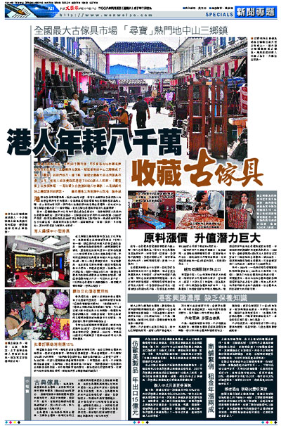 隨著古傢具(古舊、古典)的不斷升值,許多香港古玩收藏者開始將目光從陶瓷、玉器轉向古傢具。鄰近香港的中山三鄉鎮成了港人「尋寶」的熱門地方。據了解,這個全國最大的古典傢具市場,去年,僅港人的消費額就超過了8,000萬元人民幣。「尋寶客」主要有兩類,一是注重文化價值的個人收藏家;二是覬覦可將之轉賣謀利的商家。