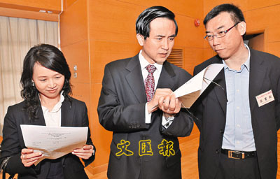 ■籌委會主任楊子剛(中)及委員容寶樹(右)、鄧淑德(左)到場為考生打氣。圖為他們正在細心閱讀考卷。