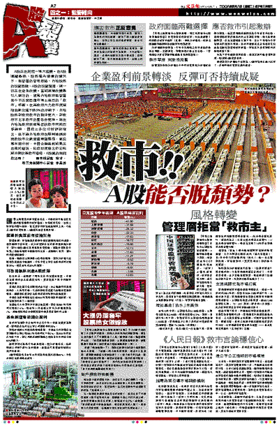 A股正在經歷一場大裂變。在A股連續暴跌、股民損失慘重的情況下,監管層的管理思路、內地股民的投資思維、A股的投資價值,這一切正在發生改變。當前這種改變最引人關注的,便是內地政府監管層至今不正面回應市場上強烈的「救市」呼聲。在美政府大力救市使道指由高位僅下跌9%的示範下,內地股民對政府救市的期待更大、對政府不出手救市的憂怨亦更深。就在內地為政府到底是否該救市而激烈爭論時,國際上多位分析師卻指出,且不論內地政府在壓制通脹和拯救股市之間面臨兩難選擇,單從基本面分析,中國企業盈利前景正在趨於暗淡,此際即使推出印花稅減半徵收等救市措施,A股真的就能救活嗎?