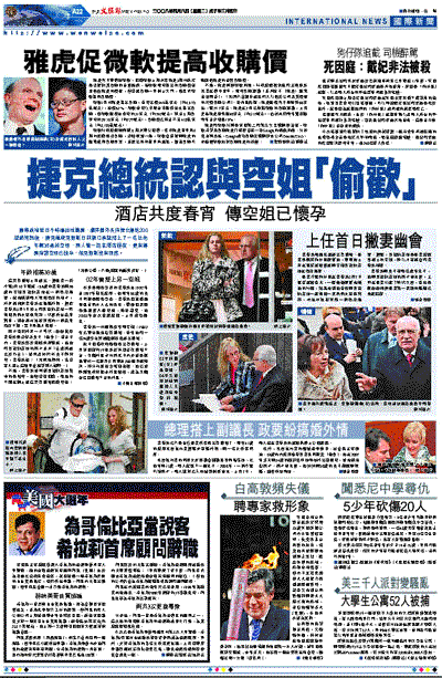 國際政壇近日不時爆出性醜聞,繼芬蘭外長向舞女傳送200淫慾短訊後,捷克總統克勞斯日前親口承認搭上了一名比他年輕38歲的空姐,兩人曾一起在酒店過夜,更有傳聞指該空姐已懷孕,但克勞斯沒有回應。