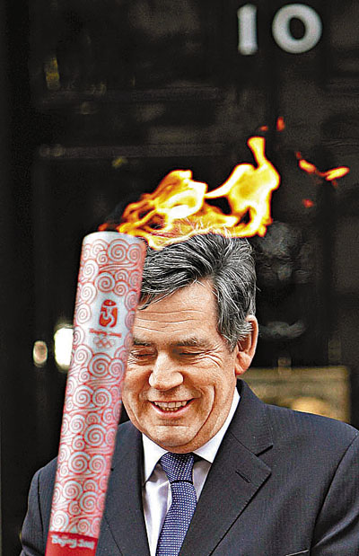 英國首相白高敦最近決定聘用35歲英國廣播公司前女監製伯德特,負責改善白高敦的形象,避免他再被媒體拍到舉止笨拙、尷尬失禮的影相,影響首相聲譽。但前日北京奧運聖火火炬接力傳遞途經倫敦時,記者又拍到白高敦頭部與聖火火焰交錯的影相,看似他頭髮著火(見圖),令他再次慘為笑柄。