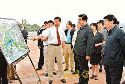 ■玉溪市委書記孔祥庚向賈慶林主席介紹出流改道工程