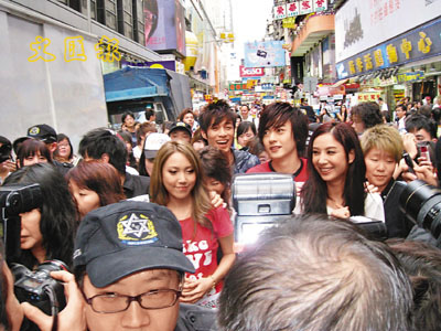 【本報訊】(記者 黃佩麗)鄭希怡、洪卓立、鍾舒漫、陳柏宇、周柏豪和唐素琪昨日現身旺角街頭,為新戲《愛情萬歲》宣傳,他們分成三組為指定的情侶牽上紅絲帶,又向途人派禮物,吸引數百Fans和途人圍觀,由於活動時間未實施封路措施,造成人車爭路的情況,加上一眾Fans十分熱情,雖然大會已安排約八名保安維持秩序,而各藝人都有助手保護,現場仍然十分混亂,有宣傳攤檔也被推倒,但人群擠擁,保安也被力阻前進。