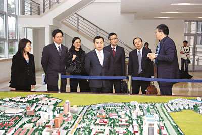 黃仁龍昨午造訪復旦大學,與校長王生洪和法律學者在培訓人才多個課題上交換意見,隨後參觀校園。圖為復旦大學負責人向黃仁龍介紹法學院的擴建計劃。