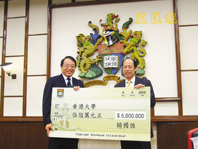 ■楊國強(右)捐款500萬元,支持港大的「第一代大學生助學金」計劃。本報記者陳倩筠 攝