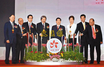 ■「雲南.香港深化服務貿易合作洽談會」開幕典禮暨簽約儀式,左起:香港中華總商會會長霍震寰、新世界發展董事總經理鄭家純、外交部駐港公署副特派員楊子剛、財政司司長曾俊華、雲南省省長秦光榮、中聯辦副主任郭莉、行政會議非官守議員召集人梁振英及金利來集團主席曾憲梓主持開幕。 本報記者張偉民 攝