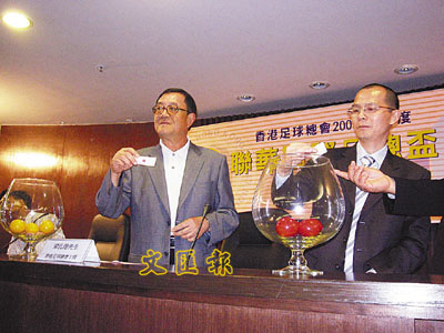 ■足總主席梁孔德(左)和贊助商尹衛東負責抽籤。本報記者潘志南 攝