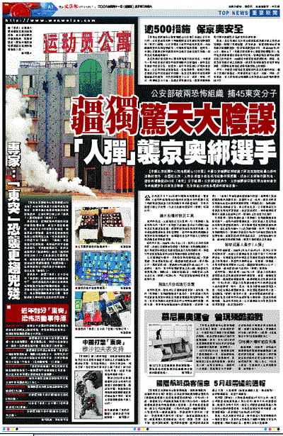 【本報北京新聞中心記者劉越山10日電】中國公安機關近期破獲了兩起策劃實施暴力恐怖活動的案件,企圖在北京、上海及烏魯木齊等城市發動炸彈襲擊、投毒以及綁架外國記者、遊客和運動員的45名「東突」分子落網。公安部官員表示,公安機關對保護民眾生命財產安全和奧運安全已有充分準備,完全有能力挫敗各種恐怖破壞活動。