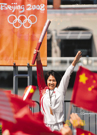 ■奧運冠軍林莉高舉第一棒火炬。 中新社