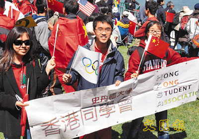 ■史丹福大學香港同學會的留學生,到現場為聖火傳遞助威。 中新社