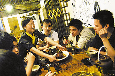 ■「英雄、女俠打擾一下,小二給你們上道『功夫』(菜)」。 本報溫州傳真