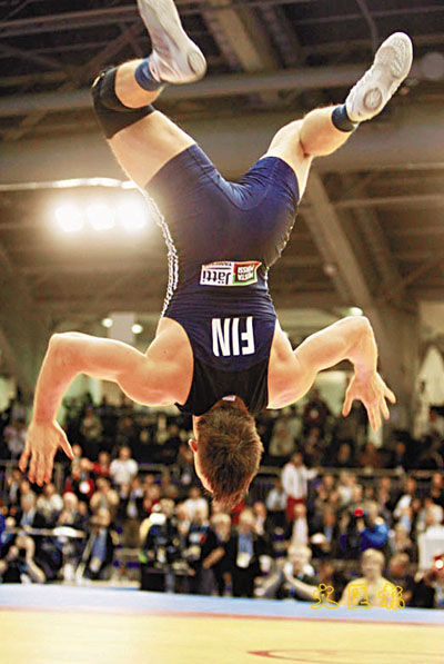 這名叫Jarkko Ala-Huikku的芬蘭運動員,在2008歐洲古典摔跤比賽(Greco-Roman 2008 European Wrestling Championship)中的男子60公斤級別打敗保加利亞選手而奪得金牌,佔主場之利的Jarkko在自己家鄉勝出,怪不得他興奮莫名。