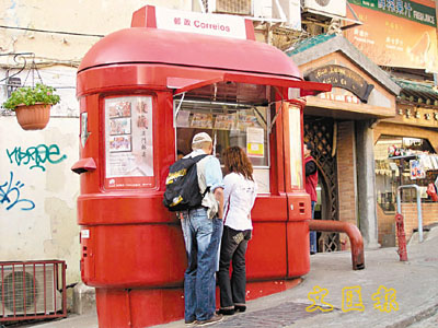 ■澳門街頭的小郵局,外形別致,遊人可在此購買澳門郵票及各類郵品,可謂麻雀雖小五臟俱全。