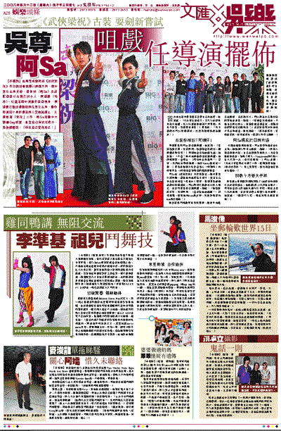 【本報訊】由馬楚成執導的《武俠梁祝》昨日假將軍澳舉行開鏡大典,戲中男女主角吳尊、蔡卓妍(阿Sa)及胡歌齊齊以古裝打扮示人,庾澄慶(哈林)、狄龍等戲中演員亦齊齊現身,庾澄慶打鼓出場歡迎兩位男女主角,動作導演程小東即場教兩人耍劍擺甫士,又揮劍寫「梁祝」二字,阿Sa活動中大講爛Gag娛賓,直言自己有武功底子,其後補鑊說:「係我自己覺得而已!」