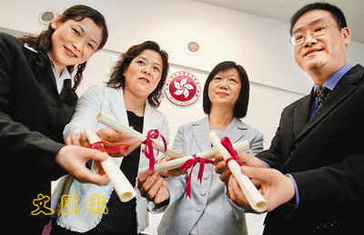 ■尤德爵士紀念基金「在職人士自我增值獎」的其中4名得主,右一是現晉升為保安主管的甄潮添、右二是開辦陪月員服務的陳彩雲。本報記者梁祖彝 攝