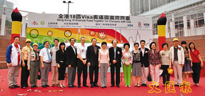【本報訊】(記者 陳巧顏)在奧運倒數的第118天,來自23個機構的繪畫代表200多人,昨日假尖沙咀九龍公園羅馬廣場,群策群力用畫刷和顏料繪出心中的奧運夢想。是次名為「全港18區VISA奧運圖畫齊齊畫繪畫嘉年華」,由民政事務總署、香港工商專業協進會及VISA主辦。