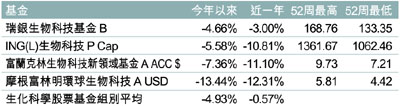 佔近今年以來榜首的瑞銀生物科技基金主要投資於參與研究、產品發展、生產及分銷的環球生物技術公司,以獲取回報。基金在2005、2006和2007年表現分別為2.92%、-0.21%及4.78%,基金平均市盈率和標準差為22.46倍及16.29。