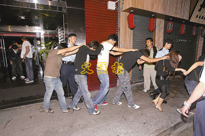 警方開燈搜查,在臥底探員逐一指證下,成功拘捕13男4女(由23至28歲),在其身上共檢獲24克K仔、70粒搖頭丸及1粒五仔等懷疑毒品,約值12,000元。稍後,該批被捕者與兩名涉超額收客的男主持人,連同證物一併帶署調查。