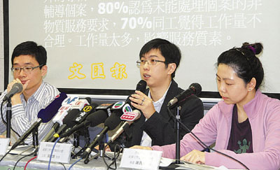 【本報訊】(記者 聶曉輝)社工「能醫不自醫」。一項調查顯示,68%醫務社工因工作過量令健康受影響,近半經常感到焦慮與抑鬱,61%曾因工作壓力考慮辭職,16%受訪者甚至想過自殺。華員會社會工作主任職系分會訪問了79名(31名普通科、48名精神科)社署轄下的醫務社工,發現每名普通科及精神科醫務社工,分別要在同一時間處理79及85個個案。他們每月值勤時平均要用97.2小時處理12個新個案。調查又顯示,86%受訪者要無償超時工作;85%受訪者認為繁重的工作量令他們未能深入輔導個案。調查機構要求當局盡快檢討社工工作壓力問題,加快招聘人手,並聘請專業會計人士處理基金託管的個案。