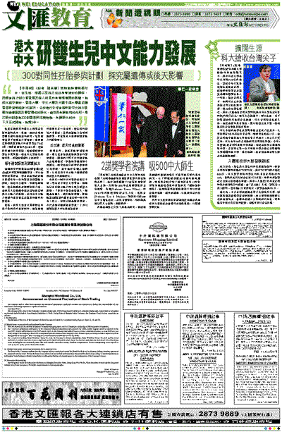 【本報訊】(記者 劉美顏)雙胞胎除樣貌相似外,在性格、際遇以至能力往往有著微妙的關係,而語言能力對心智發展及個人成長亦有著極重要的影響。為探究箇中奧妙,香港大學、中文大學及英國牛津大學最近獲香港研資局撥款160萬元,合作進行全球首個針對中文能力發展與遺傳基因及學習環境的研究,創世界有關範疇的先河。是次研究對象為300對香港同性雙胞胎,有關研究將於下月正式開始,為期3年。