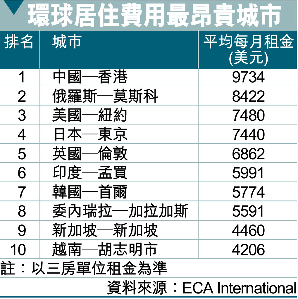 環球居住費用最昂貴城市