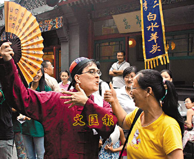 ■在北京王府井的一條街上,一名老外在展示「吆喝」技藝。