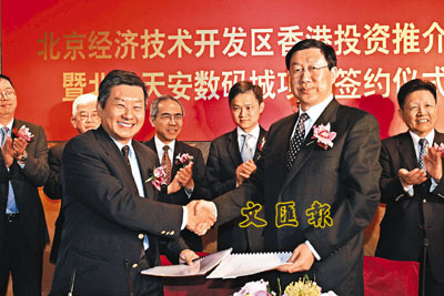 ■北京經濟技術開發區香港投資推介會暨北京天安數碼城項目舉行簽約儀式,北京經濟技術開發區管委會主任張伯旭(右)與天安中國總裁李成偉(左)握手慶祝。本報記者張偉民 攝