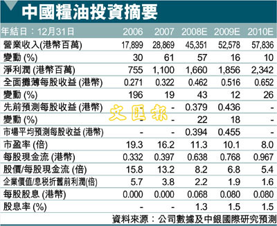 根據中國糧油控股(0606)07年優於預期的業績,我們調整了模型中的數據,此後我們將08-09年的盈利預測上調了18-22%。儘管如此,我們將目標價由6.60港幣下調至了6.24港幣(昨收5.42元),這主要是由於全球大部分替代能源公司的股價都有所下滑,因為市場目前給予替代能源公司的估值下降 (12.0倍08年預測市盈率,低於之前的19.2倍)。儘管如此,我們維持對該股優於大市的評級。