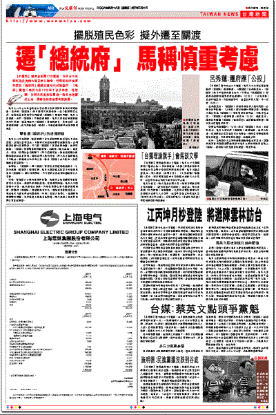 【本報訊】據東森新聞17日報道:日前台大城鄉所教授夏鑄九曾召開公聽會,呼籲新政府慎重考慮把「總統府」遷離日據時代的總督府,「總統」當選人馬英九在17日有了初步回應,他強調,如果未來能夠在關渡一帶找到適當的土地,那麼他將會慎重考慮搬遷。