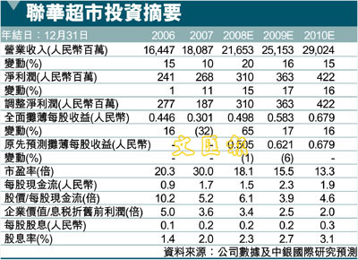 我們認為未來同店銷售收入增長將持續強勁,在店面網絡擴張恢復的基礎上將轉化為公司收入增長的動力。聯華超市計劃08年開設65間直營店,其中15間為大賣場,30間為超市,20間為便利店。綜合同店銷售收入可能增長7-10%的預期,08年聯華超市的收入預計將同比增長20%。此外,聯華超市將開設335間加盟店,其中155間為超市,180間為便利店。隨著加盟店比率從07年末的56%提高至08年末的63%,我們預期整體毛利率將小幅下滑,因為聯華超市將增加以成本價(零毛利率)向加盟店的銷售,而銷售、一般和管理費用佔收入比率將略有上升,因為公司不需要承擔加盟店的經營費用。