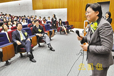 新任全國人大常委范徐麗泰昨日於香港專上學院演講,開宗明義表示自己是普通人,更與學生分享自己從中七畢業到現在擔任人大常委的心路歷程。她坦言,當年希望回饋香港社會,到現在期望可擔當內地與香港之間的橋樑,反映雙方意見,增加雙方理解。
