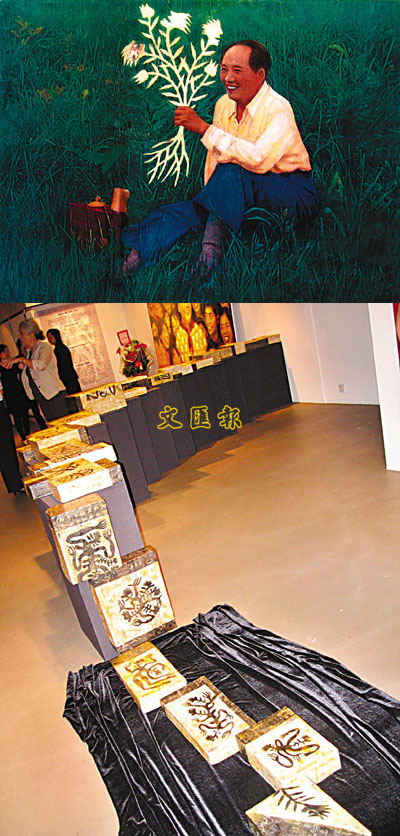 裝置「記憶之流」亦是如此,一個個盒面,以旅行的地圖或是文字的碎片為背景—其中一幅是張曉剛畫作的局部—加上「人.植物」,排列成為藝術家的流動日記。