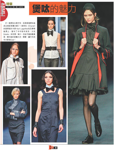 打一個煲呔比較中性,但是兩個煲呔就見出俏皮和層次感了。香奈兒(Chanel)的首席設計大師 Karl Lagerfeld在巴黎時裝周上,發布了今年秋冬系列,大玩Details,如衣領、袖口、仿皮手套加點意思,頓令設計更顯大方、簡單,讓今年的冬天更加Cool。