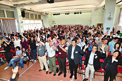 ■福德學校昨舉行護校行動,近500名師生、家長及舊生出席支持。