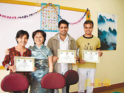 ■河北經貿大學與尼泊爾加德滿都大學合建孔子學院。圖為何懿老師(左二)和她的尼泊爾學生。