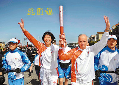 北京奧運會聖火傳遞活動在美國舊金山舉行,火炬手郎平(左二)與火炬手詹姆斯.多蘭共舉火炬傳遞。