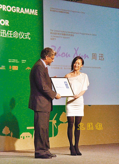 ■聯合國開發計劃署駐華代表馬和勵任命周迅為親善大使。