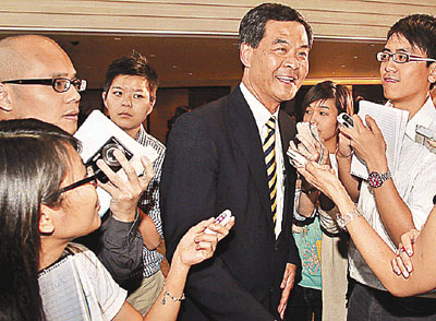 公私分明連日來不斷就最低工資立法問題隔空駁火的兩位男主角,行政會議召集人梁振英(見圖)及自由黨主席田北俊,昨日在自由黨黨慶活動上首次碰頭。田北俊表示,在會前有機會與梁握手,雙方未有談及最低工資立法的問題,但梁事先表明要趕赴另一活動,將會提前離開。