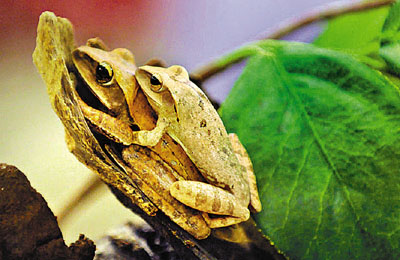 ■斑腿泛樹蛙叫聲低沉,圖為交配繁殖時情況。 本報記者高仲明 攝