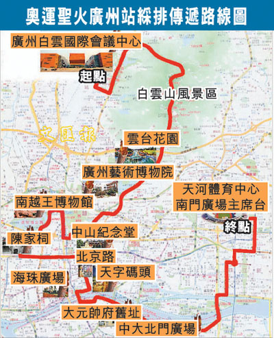 【本報珠三角新聞中心記者敖敏輝23日電】23日下午4時至翌日凌晨,廣州在全城預演北京奧運會聖火傳遞。預演從白雲國際會議中心開始,模擬聖火在多輛警車和大量警察沿途護送下,登上白雲山山頂公園。據主辦方介紹,聖火傳遞從白雲山出發,將途經雲台花園、廣州藝術博物院、中山紀念堂、陳家祠、北京路、海印公園、領事館規劃區廣場、天河體育中心等十大景點,路線正好呈現廣州城標五羊雕塑的輪廓,別具創意。